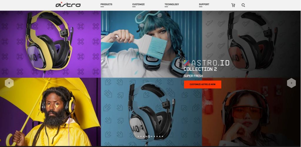 This website page is about gaming headphones and how there is good quality but different designs to choose from. This page creates similarity because the same element which is headphones is being used giving relevancy. The attributes being used are color and orientation. The color attribute is being used to create similarity with the same element but the color makes the similarity more effective. The orientation attribute is being used to separate the headphones which create a similar relationship between the headphones.